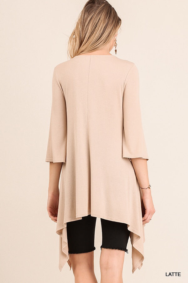Asymmetrical Tunic with Criss Cross Neckline and Bell Sleeves